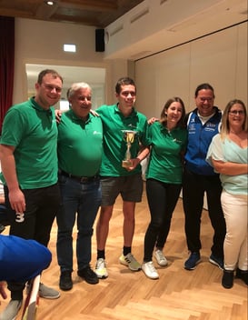 Kurz vor dem Mittag starteten die Herren gleich gegen den Turnierfavoriten Bozen 1 ins Turnier. Mit einer 3:1 Niederlage glückte der Auftakt nicht wie gewünscht, jedoch konnten die Herren in den folgenden Spielen aufdrehen. Beim Spiel gegen Bergamo verletzte sich Joël, sodass er das Turnier nur noch von der Mannschaftsbank aus mitlenken konnte. Ramona, die am Morgen noch bei den Damen mitspielte, tat nun bei der Herrenmannschaft mit. Je länger das Turnier dauerte, desto besser kamen die Glarner ins Spiel. Und nach der Vorrunde war klar: Es reicht für das Halbfinale! Als viertplatzierte Mannschaft musste man es nun noch einmal gegen das erstplatzierte Bozen 1 aufnehmen. Dieses Mal war es aber ein Spiel auf Augenhöhe! Nach der regulären Spielzeit stand es 3:3 und es ging in die Verlängerung. Die Glarner der Sensation nah, sah das Heimteam schon seinen Turniersieg in Gefahr. Leider gelangen die gewünschten "Hüpfer" in der Verlängerung nicht mehr gleich gut, und so konnte Bozen 1 das Spiel schlussendlich mit 5:3 nach Verlängerung für sich entscheiden. Nach diesem spannenden Match waren die Glarner nun aber hochmotiviert, wenn schon nicht Gold oder Silber doch noch Bronze zu erreichen. Dies musste nun gegen Trento erreicht werden, gegen die man in der Vorrunde knapp verloren hatte. Nach einem langen Turniertag war nun die Frage, welches der beiden Teams seine Kräfte noch einmal bündeln konnte- Trento oder Glarus? Diese Frage entschieden die Glarner klar und spielten dem gegnerischen Team den Ball nur so um die Ohren. Schlussendlich stand es 4:1 und TB Glarus 11 holte sich klar den dritten Platz.